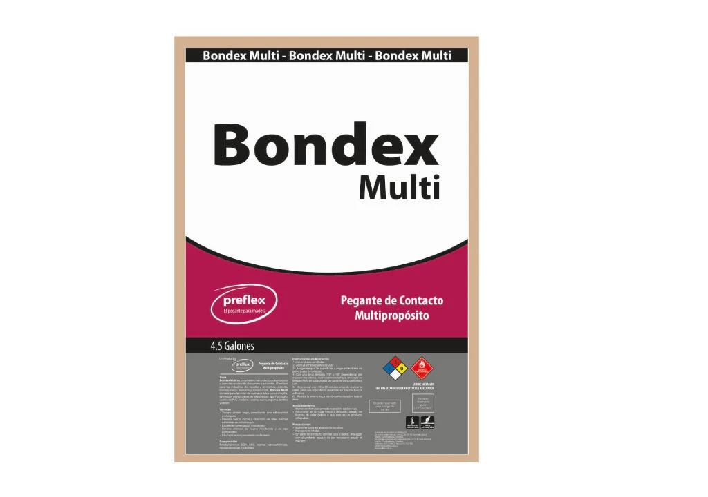 Pegante bondex k multi 4.5 galones adhesivo de policloropreno ideal para procesos de laminación, enchape de cantos de PVC y postformado de alta presión en la industria de la madera. Destaca por su rápido desarrollo de fuerza inicial, fácil aplicación y buena humectación. Desarrolla una alta fuerza final y es adecuado para aplicaciones manuales.