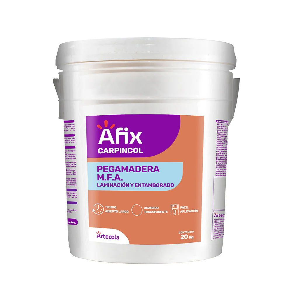Pegante pegamadera mfa 20kg diseñado especialmente para la industria del mueble y la madera, en procesos de laminado, enchapado y postformado, entre otros. ideal para la unión de sustratos tales como chapilla, laminados estructurales de alta presión tipo Formica®, cantos de PVC o caucho sobre aglomerados de fibra, MDF o tríplex. Enchape Laminación Fijado de Cantos, posformados y Tapicerías. Tiene una vida útil de 12 meses y se deben cumplir las recomendaciones que da el proveedor.