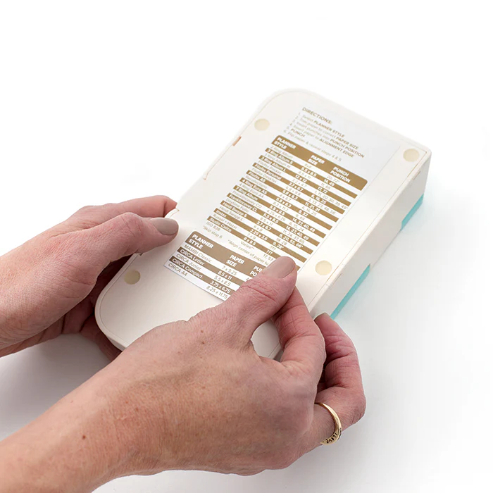 Solo tendrás que consultar las instrucciones que trae, con las marcas más comunes de planners del mercado, y colocar los cabezales en la posición indicada. Luego baja la tapa y perfora tus hojas de una forma sencilla y cómoda.
