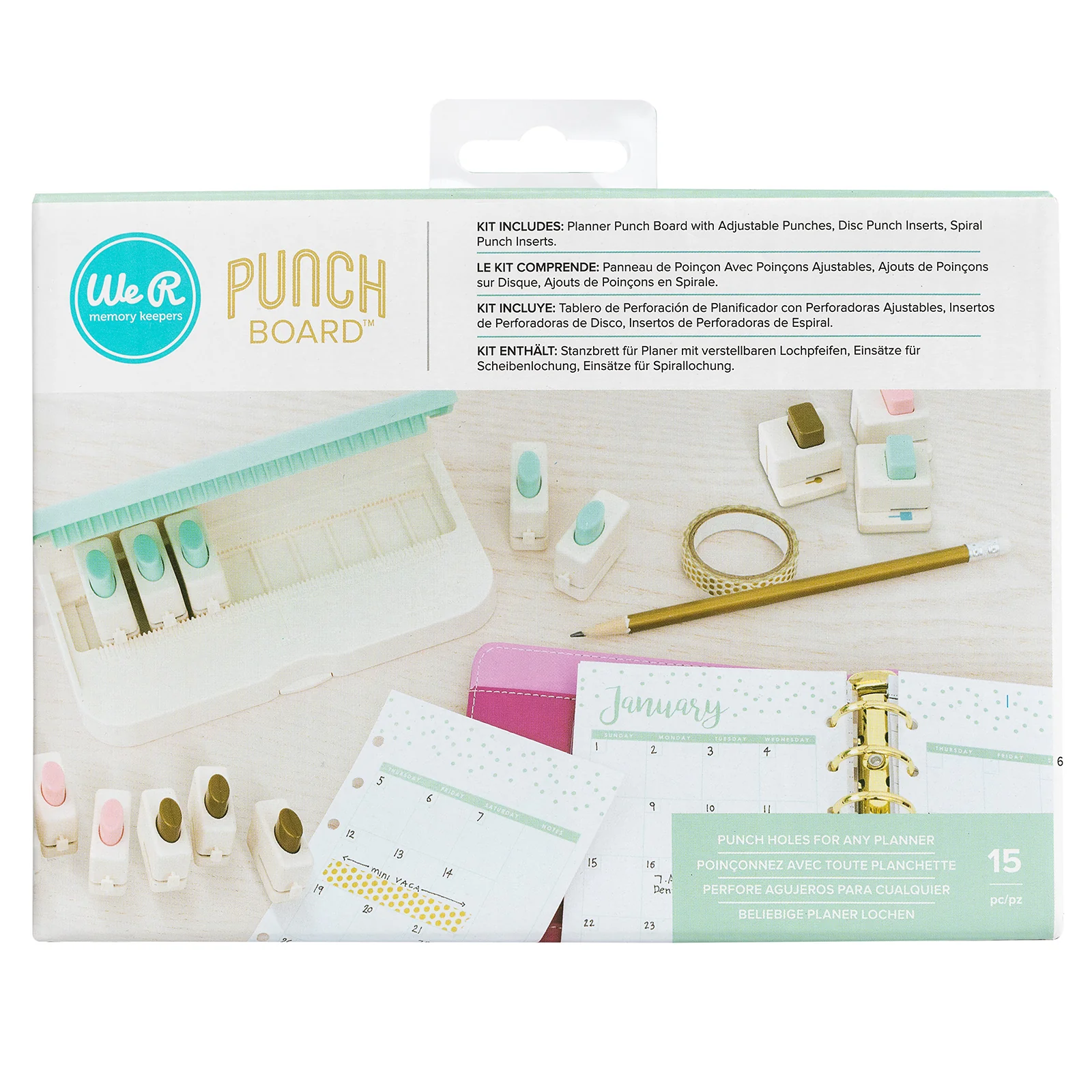Esta herramienta es una perforadora de agujeros que tiene unos cabezales intercambiables, lo cual permite hacer los agujeros a diferentes distancias y medidas, adaptándose a cada modelo, marca y tamaño de planner.