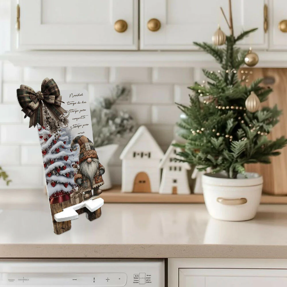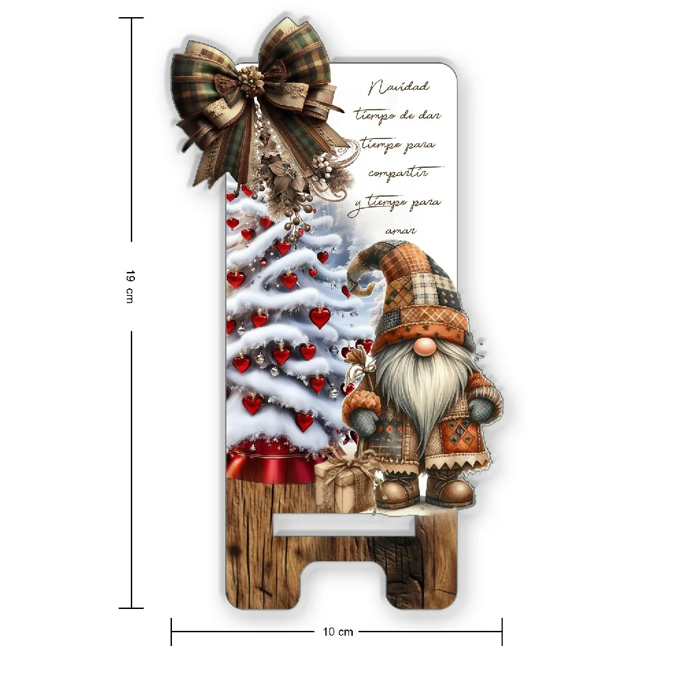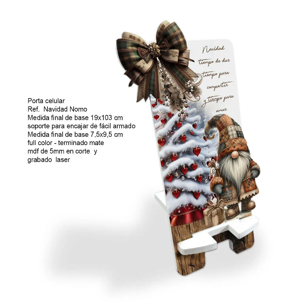 PORTACEL-Nomo – mdf corte y grabado laser, impreso Full Color terminado mate (19 x 10cm), soporte para encajar de facil armado; color Blanco y Madera