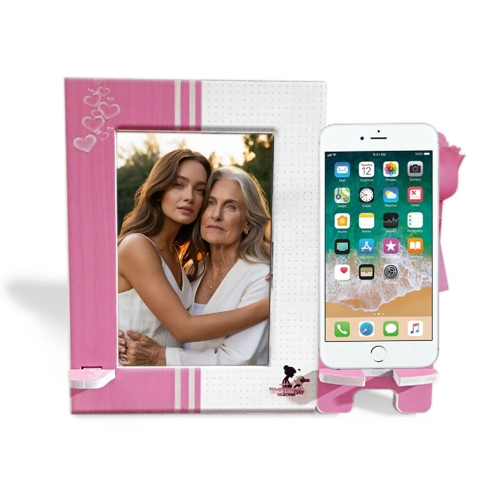 Portarretrato con portacelular – mdf corte y grabado laser ( 20,5cm X 24,5cm) fotografía 10×15 cms, vidrio de 2 mm ajustable con flexipuntas, tapa en mdf con pata escualizable, color Rosado y Blanco
