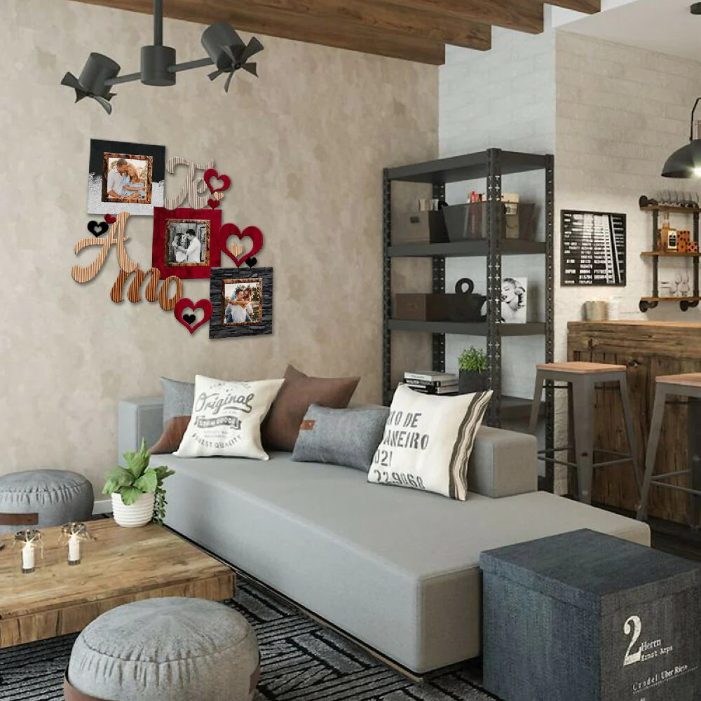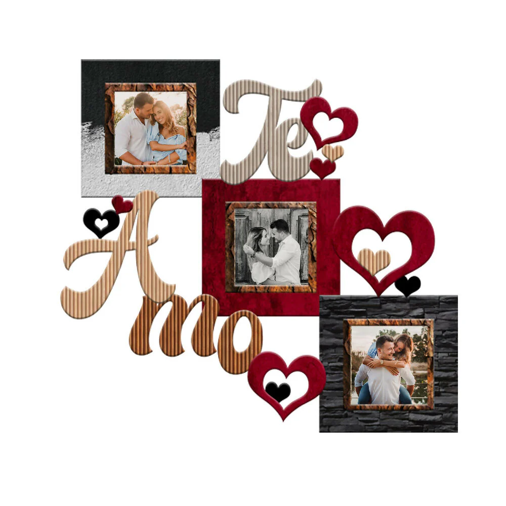 Cuadro decorativo de pared Triptico Te Amo – 02 – mdf corte laser- Full Color (46,5cm x 38,5cm) fotografía (3) medida 10 cm x 10 cm, vidrio 2 mm ajustable con flexipuntas, tapa en mdf; Color Rojo y Gris Oscuro