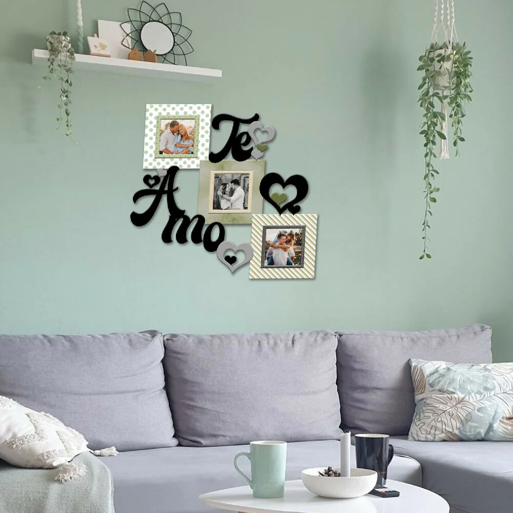 Cuadro decorativo de pared Triptico Te Amo – 04 – mdf corte laser- Full Color (46,5cm x 38,5cm) fotografía (3) medida 10 cm x 10 cm, vidrio 2 mm ajustable con flexipuntas, tapa en mdf; olor Verde Claro y Negro