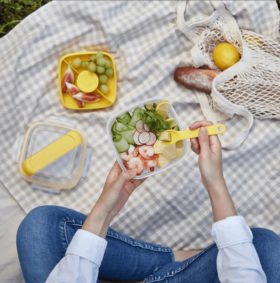 Recipientes herméticos con compartimentos para separar los alimentos evitando que se mezclen entre si. Su hermeticidad permite no solamente llevarlos con tranquilidad sino asegurar que los alimentos siempre estarán frescos a la hora de consumirlos. Diseños únicos, modernos e impecables. Incluye recipiente para salsas y cubiertos (cuchillo ye tenedor). Ideal para llevar tus ensaladas. Libre de BPA. Apto para microoondas (con tapa sobrepuesta) y lavavajillas