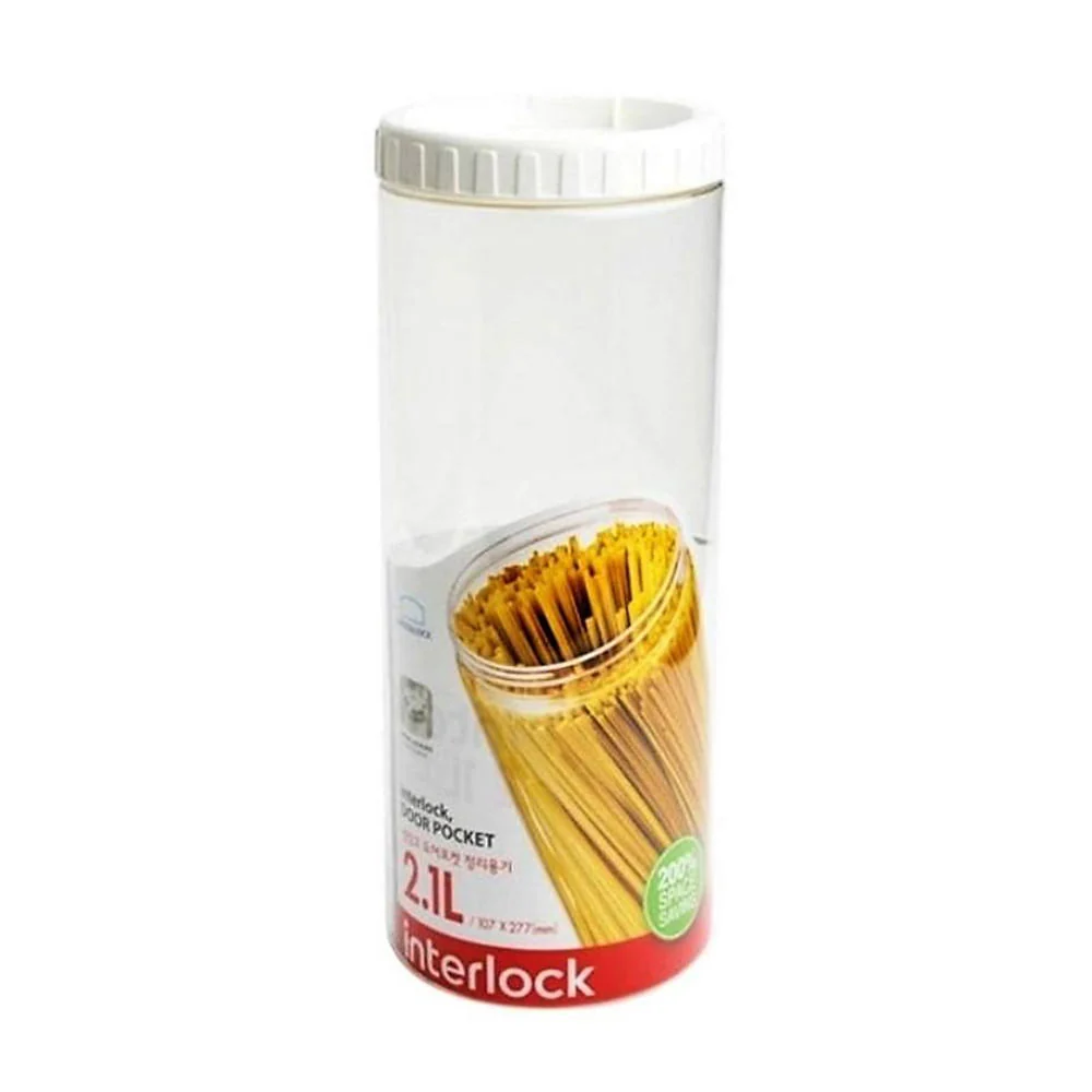 Recipiente circular 100% hermético con tapa rosca y sistema de ensamble entre recipientes ayudando en la optimizacion del espacio de manera vertical, ideales para ahorra espacio en la puerta de la nevera y despensa., ideal para guardar granos, pastas, cereal.