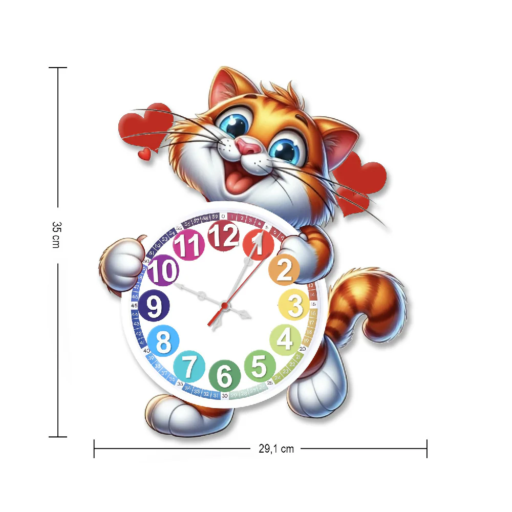 Reloj de Pared KIDS-GATO – mdf de 9mm en corte laser e impresión Full Color de (35cm x 29cm) manecillas de presión hechas en acrilico, apliques en madera de 3mm. Color Blanco y Naranja