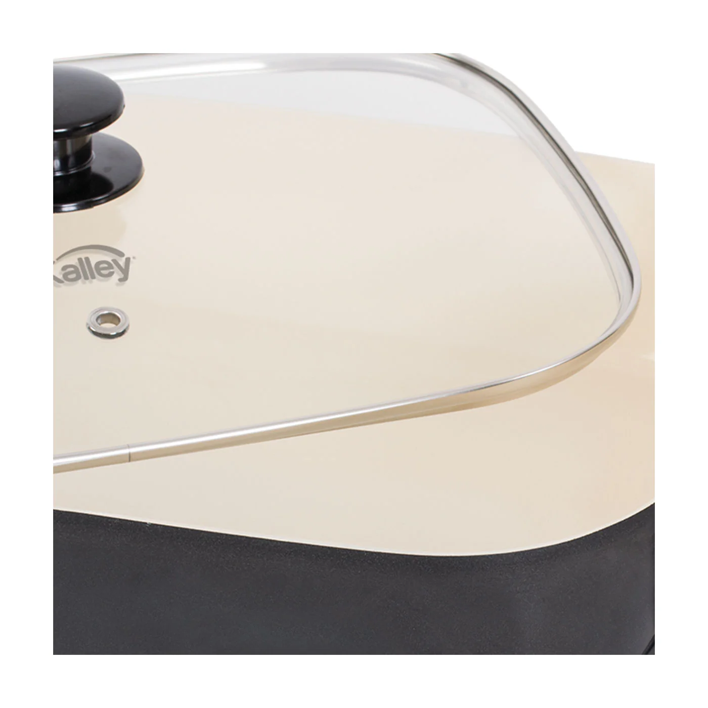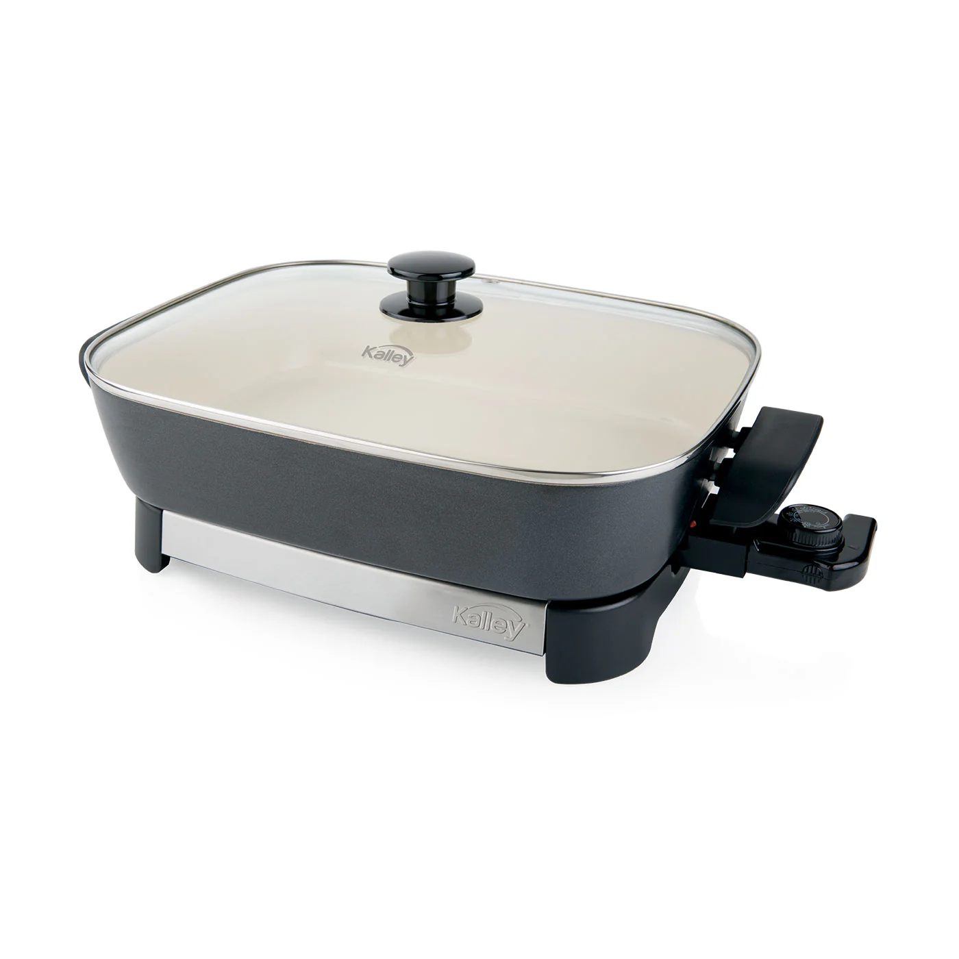 El sartén de cerámica eléctrico KALLEY K-SER120C, es tu aliado perfecto para cualquier preparación. Tiene recubrimiento en cerámica que evita que los alimentos se peguen a la superficie, la cerámica permite una distribución mas uniforme del calor, brinda mayor durabilidad y no necesita el uso de aceites adicionales, antes del primer uso recomendamos curar la cerámica con un poco de aceite a una temperatura media para mejor desempeño. Cuenta con selector de temperatura para ajustarla según tus necesidades, asas frías al taco para mejor manipulación y tapa de vidrio para revisar los alimentos de forma segura. ¡No te quedes sin la tuya!