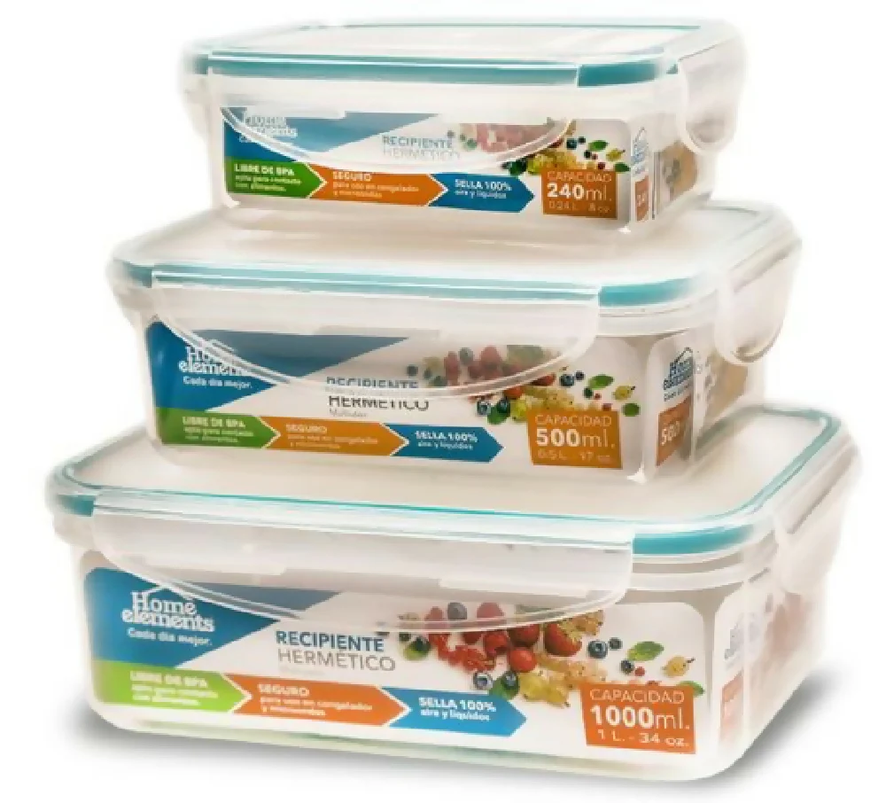 Set de 3 Recipientes Herméticos Rectangulares Home Elements, solución perfecta para almacenar alimentos de manera segura y conservar su frescura por más tiempo.