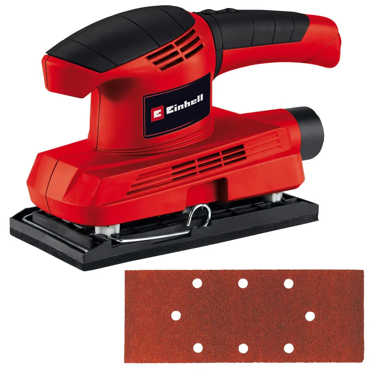 La sierra caladora TC-JS 60/1 de Einhell es la herramienta ideal para realizar trabajos de corte en el cobertizo, el garaje y la bodega para entusiastas del bricolaje. Tiene un motor de 400 W para mucha potencia. Ya sea para madera, plástico o incluso acero, aborda sin esfuerzo una amplia variedad de materiales. La acción de péndulo de cuatro posiciones permite realizar cortes exactos y rápidos. En madera, la sierra puede utilizarse para cortar a una profundidad de 80 milímetros. En plástico permite una profundidad de corte de hasta 20 milímetros y en acero de hasta 10 milímetros con el mínimo esfuerzo. Las superficies de agarre suave hacen que la sierra de calar Einhell TC-JS 60/1 se adapte cómodamente a la mano, lo que hace que sea agradable trabajar con ella. La herramienta permite cortes a inglete en ángulos de hasta 45 grados. El extractor de polvo mantiene el área de trabajo limpia. La hoja de sierra se puede cambiar de forma rápida y sin esfuerzo, sin necesidad de herramientas de ningún tipo. No incluye hoja de corte; La lijadora orbital de 1/3 TC-OS 1520 es un dispositivo práctico de alta calidad que proporciona un lijado de superficies uniformes. Gracias al dispositivo de sujeción así como a su cierre de gancho y bucle, la lija abrasiva es seleccionable y se puede cambiar fácil y rápidamente. Debido a sus grandes secciones de agarre ergonómicas, la lijadora orbital TC-OS 1520 se puede manejar convenientemente y se puede conducir con precisión para obtener resultados de lijado perfectos. El práctico adaptador de vacío permite la conexión directa de un aspirador para la extracción de polvo de lijado. Para un inicio inmediato de la operación, se incluyen 3 papeles de lija.