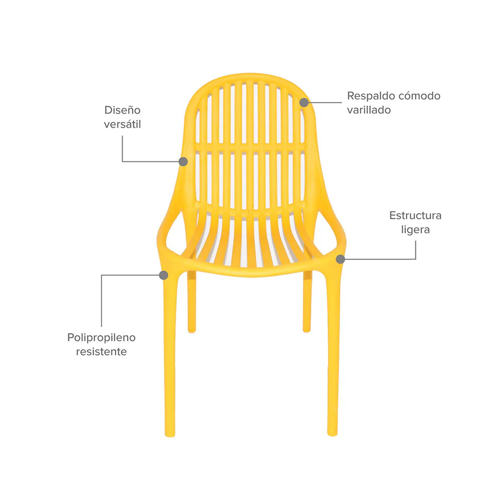 Dale un toque moderno y funcional a tus espacios con esta silla plástica de diseño varillado. Su estructura elaborada en polipropileno de alto impacto la hace resistente y liviana. Ideal para salas, bares y terrazas, es una opción versátil para interiores y exteriores. Además es apilable y no requiere armado, perfecta para un uso funcional.