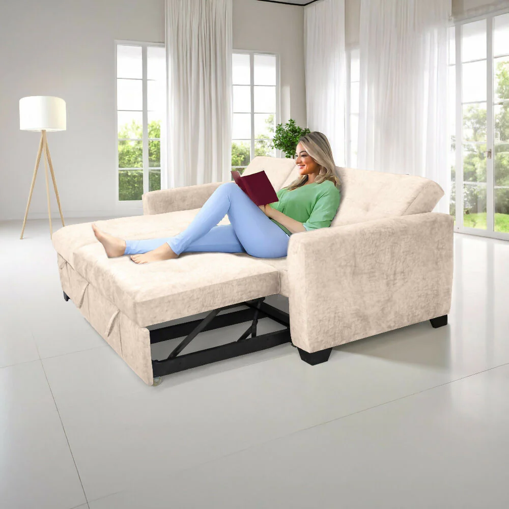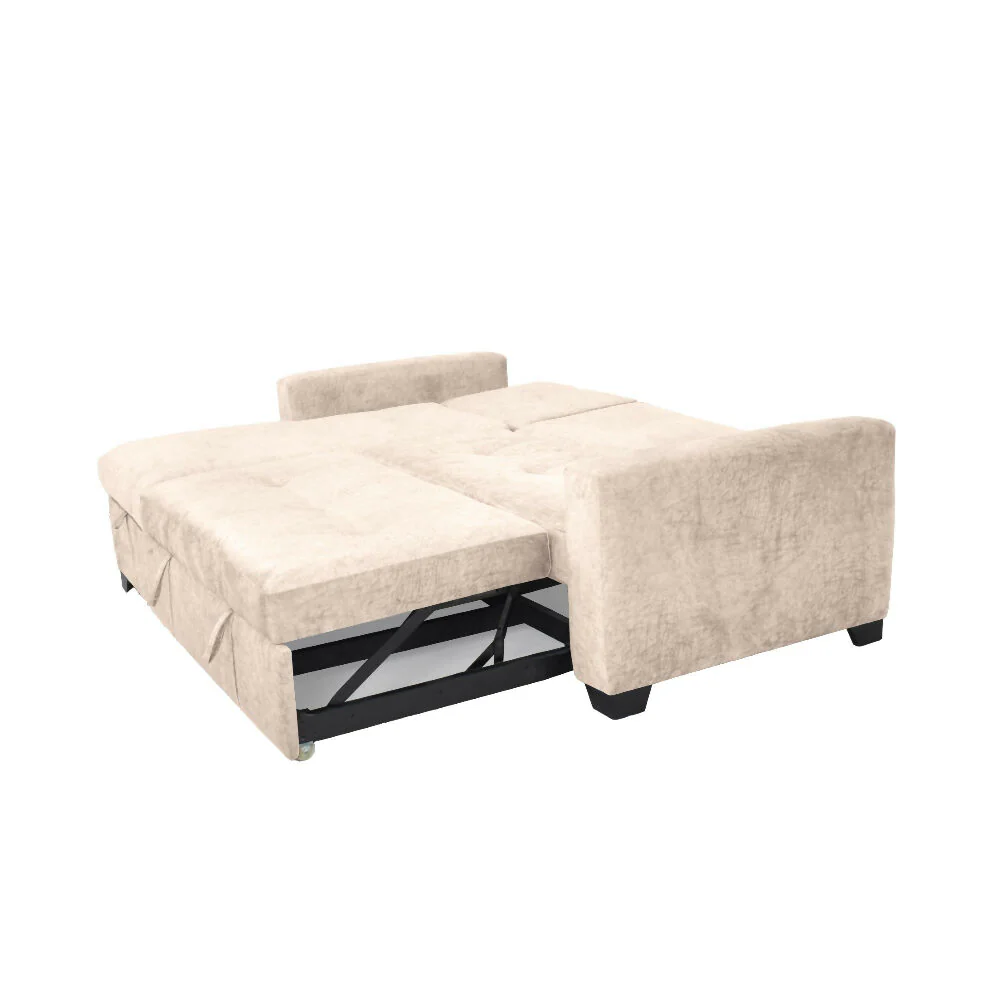 Se distingue por su diseño amplio y contemporáneo. Conformada por un sofá cama y un chaise, estructura de madera de pino inmunizada, relleno de espuma de alta densidad, tapizado en tela poliéster. Cuenta con sistema de reclinación tipo clic clack que permite ajustar el respaldo en tres posiciones diferentes. Además, su herraje de cajón ofrece la opción de desplegar un módulo adicional para transformar el conjunto en una cama de 180 cm x 185 cm. El chaise también incluye un compartimiento interno tipo baúl que mide 104 cm x 57 cm x 21 cm.