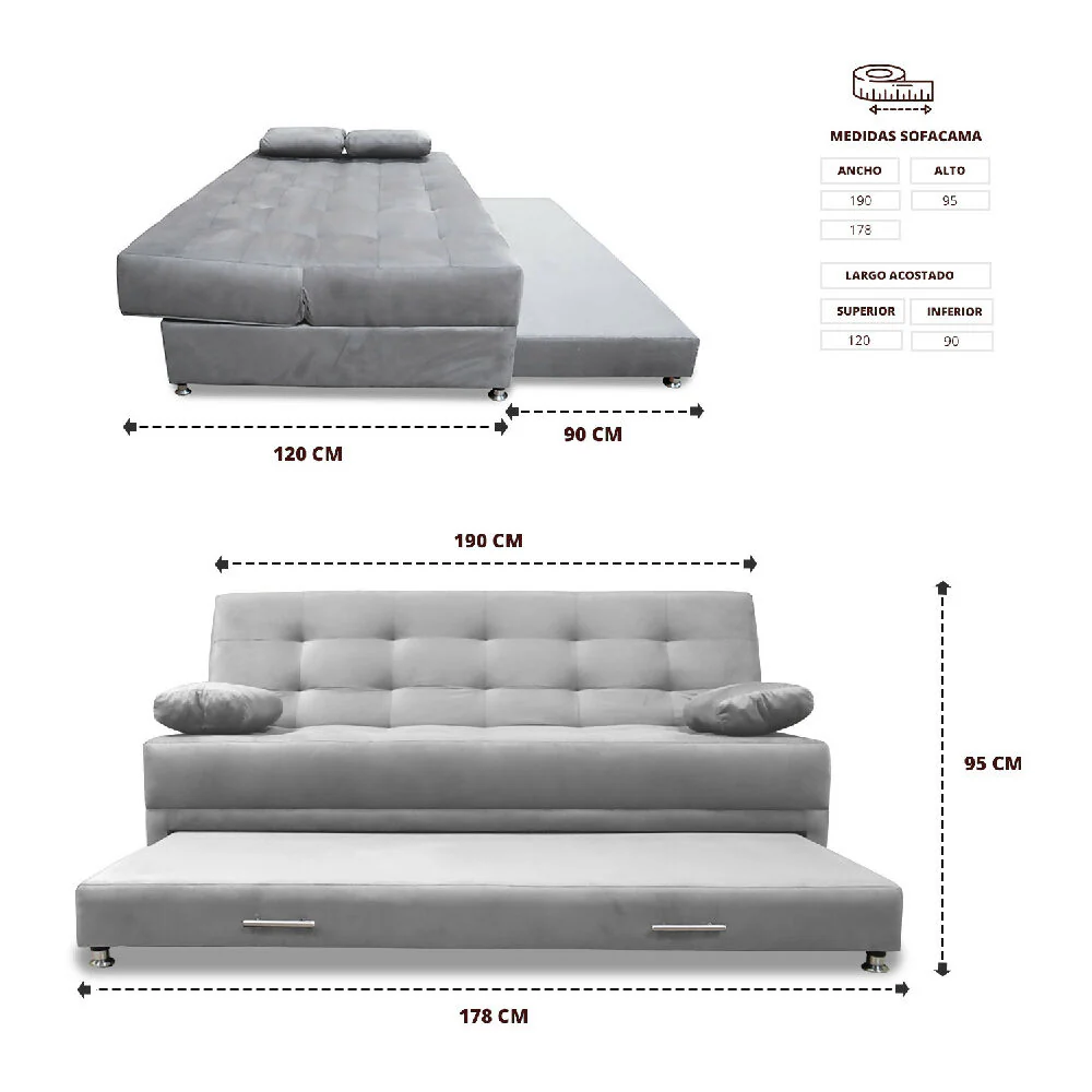 Sofacama 3 Posiciones 190×95 Cama interna con 180×90, Tela tipo Lino color Plata, desarrollado para espacios reducidos, fresco al clima, suave al tacto y fácil de limpiar, estructura fabricada en madera Pino inmunizada, relleno en espuma de alta densidad, patas aceradas con antideslizante que evitan rayaduras en los pisos.