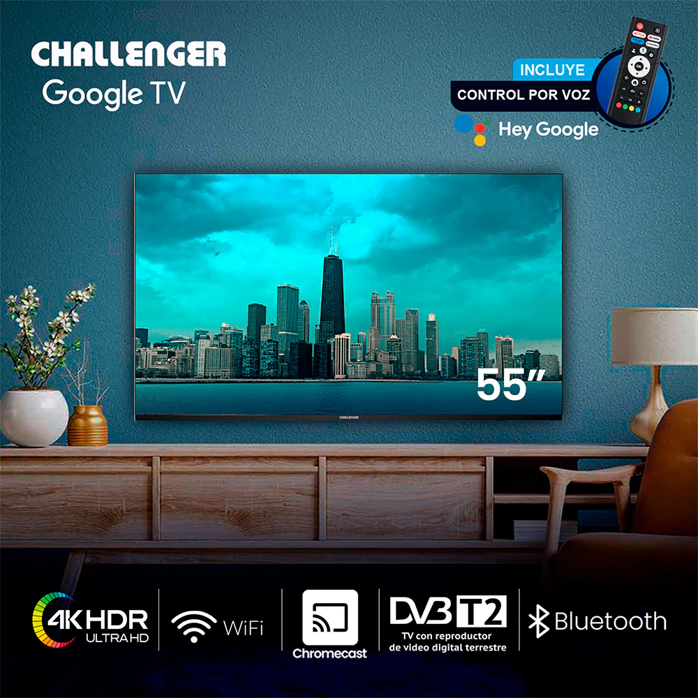 Descubre el Televisor 55 Pulgadas Smart Google TV Challenger, un dispositivo que transforma tu experiencia de entretenimiento en casa. Con una impresionante resolución 4K (3840 x 2160), cada imagen cobra vida con colores vibrantes y detalles nítidos, ideal para disfrutar de tus películas y series favoritas.