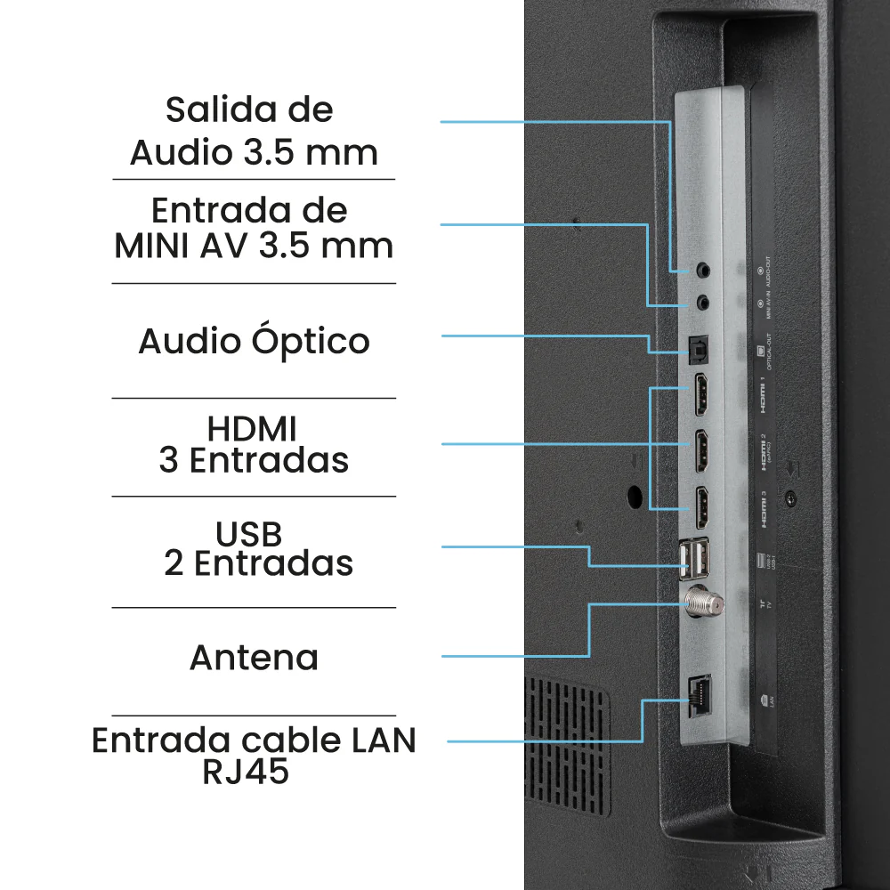 Su diseño elegante en color negro se adapta perfectamente a cualquier espacio, mientras que su soporte de pared incluido te brinda la flexibilidad de colocarlo donde desees. Con múltiples puertos HDMI y USB, así como conectividad Wi-Fi y Bluetooth, podrás conectar todos tus dispositivos sin complicaciones.