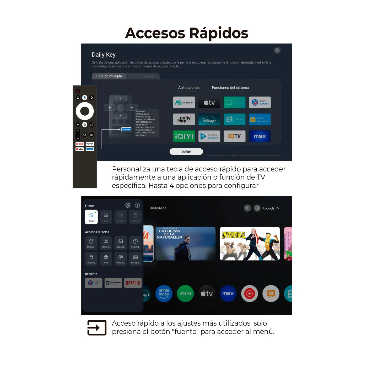 Vive el entretenimiento como nunca con el televisor Kalley MINILED QLED con sistema operativo Google TV. Su tecnología avanzada ofrece colores vibrantes y contrastes profundos, mientras que Dolby Vision y Dolby Atmos con 50W de potencia y con subwoofer incorporado te envuelven en imágenes impactantes y sonido envolvente. Diseñado para gamers cuenta con funciones premium, AMD Free Sync Premium, VRR y ALLM, su tasa de refresco nativo de 144hz brinda una experiencia fluida y sin retrasos, cada detalle cobra vida, cada juego se siente más real.