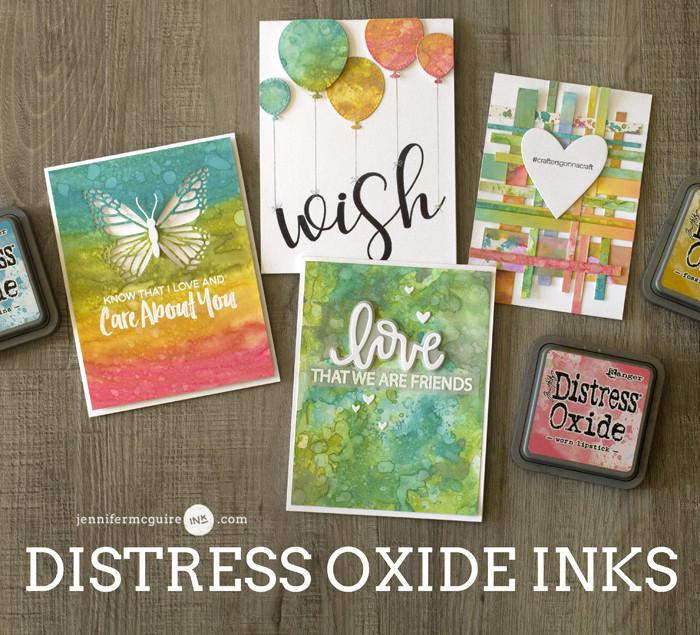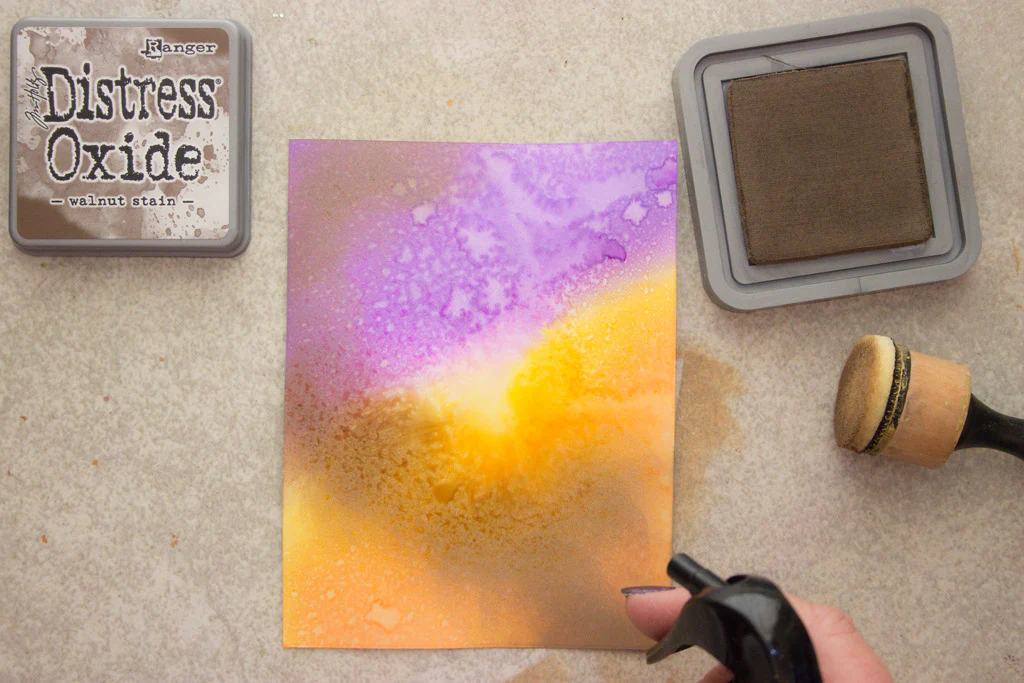 Las Distress Oxide tienen una base compuesta de pigmentos y tinte, y, además reaccionan al agua. Que tengan una parte a base de pigmentos significa que vamos a poder trabajar con ellas sobre superficies oscuras como el kraft o el negro. El color de la tinta se seguirá viendo porque los pigmentos son opacos. Además, gracias a esta propiedad podemos construir múltiples capas una encima de otra sin que los colores se mezclen (si la capa anterior está seca, si está mojada se mezclarán). El acabado es chalky (tiza).
