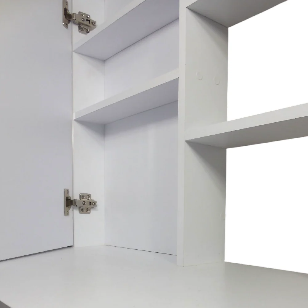 Tocador en melamina blanca de 15 mm con protección antimicrobiana al 99.9%, perfecto para mantener todo limpio y ordenado. Incluye puerta con espejo y repisas para organizar tus productos favoritos.